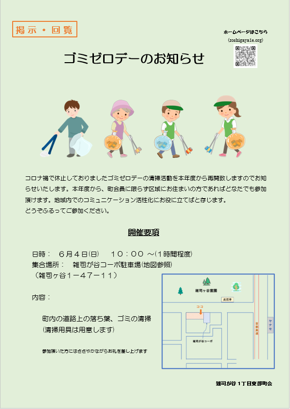 ごみゼロデーのお知らせ(回覧・掲示) 2023年5月5日 最終更新日時 : 2023年5月5日 zoshigaya ゴミゼロデーのお知らせです。回覧・掲示いたします。 ご参加、ご検討ください。 【 ごみゼロデーのお知らせ 】